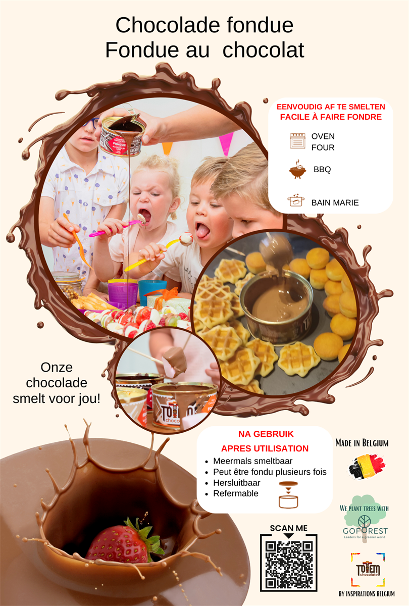 Onze Totem fondue melkchocolade smelt voor jou. Het past goed bij al jouw favoriete hapjes: shamallows, koekjes, roomijs, seizoensfruit (vers of gedroogd). Maak rotjes en lolly’s met kleurrijke decoraties en figuren met onze Totem fondue melkchocolade.